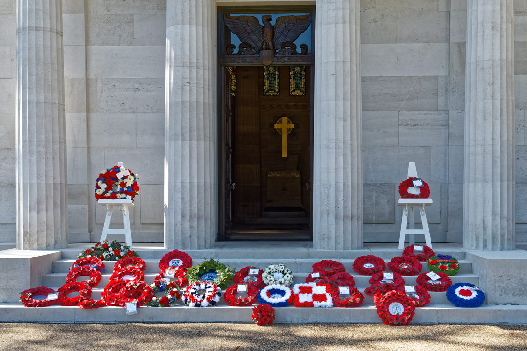 Sun 27th May 2018 Brookwood American Cemetery, Surrey UK. The wreaths laid during the ceremony on the steps of the Chapel at the Brookwood American Military Cemetery