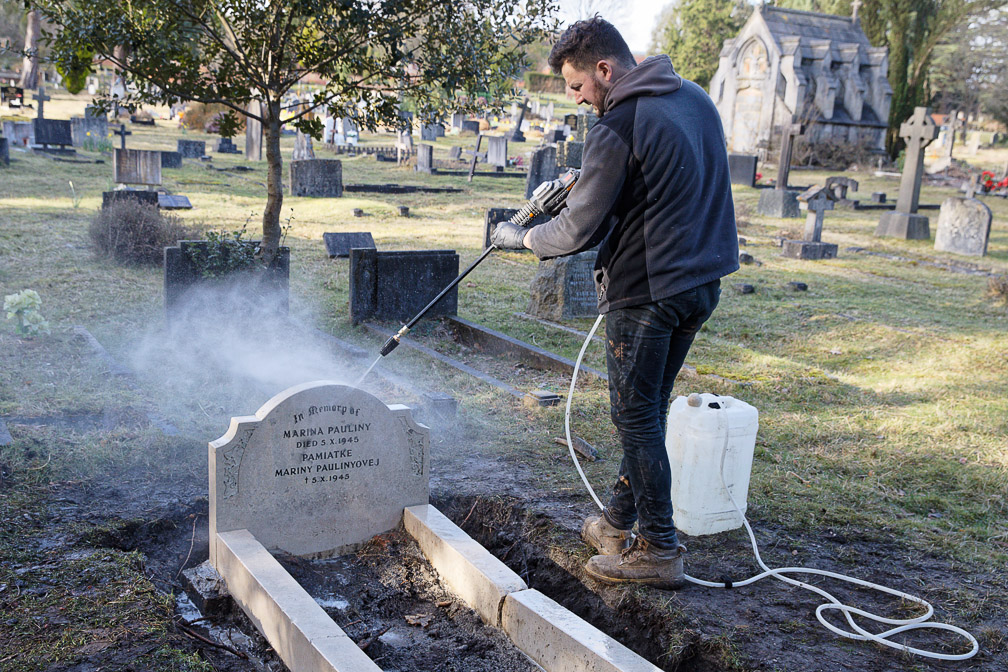 Owen Davis of Haven Memorials explained the various steps needed to renovate Marina Paulinyova's grave. Here Owen is using a jet washer to remove the first application of chemical cleaner applied previously.